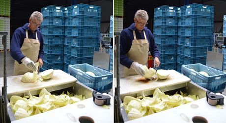 De volgende kool ligt te wachten. Jan Groen verwijdert het buitenste blad, snijdt de kool doormidden verwijdert de stronk en legt de halve kolen in een kist. De stronk verdwijnt in een afvalbak. Op de achtergrond speelt een radio. De volgende kool ligt al op de snijplank.