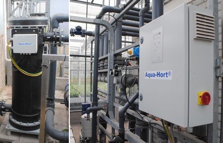 De installaties van Aqua-Hort. Na de mengbakken gaat het water door de Aqua-Hort installatie. Het water kan gewoon gerecirculeerd worden: in de Aqua-Hort wordt het gewenste niveau koperionen gerealiseerd.