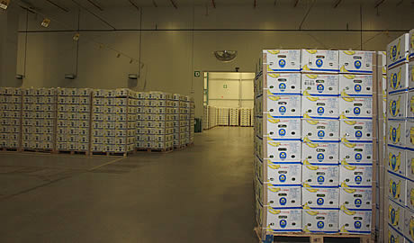 EuroFruitPorts heeft een koelhuis van 13.600 m2 en deze is volledig operationeel op een totale site van 38.700 m2. "We vinden het belangrijk dat alles veilig is en netjes blijft, dus daar wordt streng op gecontroleerd", benadrukt Peter. "Per jaar lossen we zo'n 200.000 ton fruit uit het schip en 50.000 ton uit containers. Dat is gemiddeld 3500 pallets bananen en 1000 pallets ander fruit per week. Het meeste fruit staat is hier binnen enkele dagen weer weg. Op vrijdag blijven er nog enkele honderden pallets staan en maken we de opslagruimte weer gereed voor de nieuwe aankomsten van maandag."