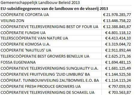 Op nummer twee staat Veiling ZON, op de voet gevolgd door Best of Four. Dat blijkt uit de EU-subsidiegegevens van de landbouw en de visserij die RVO gepubliceerd heeft.