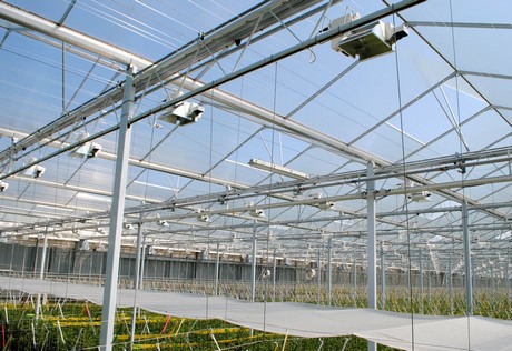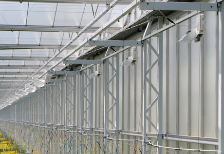 Achter hangen de conventionele armaturen. Inmiddels ingepakt in plastic. De nieuwe reflectoren worden helemaal tegen de zij- kopgevel van de kas geplaatst. Dankzij de reflectoren valt er genoeg licht in het gewas en minder op het gevelscherm.