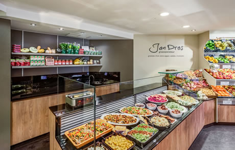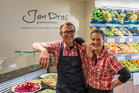 Jan, geboren in een echte groentespecialistenfamilie, drukte meteen een stempel op de zaak door gesneden groenten en rauwkost te gaan verkopen uit een gekoelde toonbank. In de loop der jaren is het gesneden assortiment steeds belangrijker geworden en levert Jan Dros een ruim assortiment salades, fruitsappen, kant-en-klaarmaaltijden en desserts. "In ons snijbedrijf bij de winkel snijden wij het hele pakket dagelijks vers. Dat doen we voor de verkoop in onze winkel, maar ook voor collega-groenteboeren, groothandels, zorginstellingen, horeca en fabrieken."