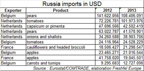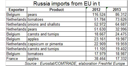 In exportvolume nemen België en Nederland afwisselend de eerste negen plekken in. Tiende staan Franse appelen met een volume van 17.332 ton, een aanzienlijke daling ten opzichte van de 38.000 ton een jaar eerder. Het grootste exportproduct uit West-Europa bestaat uit Belgische peren met 86.000 ton, ook een forse daling ten opzichte van de 116.000 ton die een jaar eerder naar Rusland verscheept werden. Na de Belgische peren volgen Nederlandse tomaten met 73.626 ton. De tomatenexport groeide wel fors van krap 52.000 ton in 2012. Daarna volgen uien, peren, wortelen en appelen.