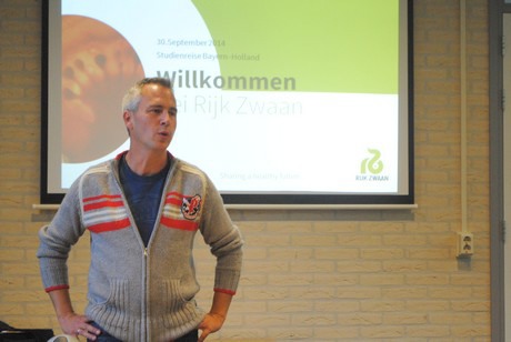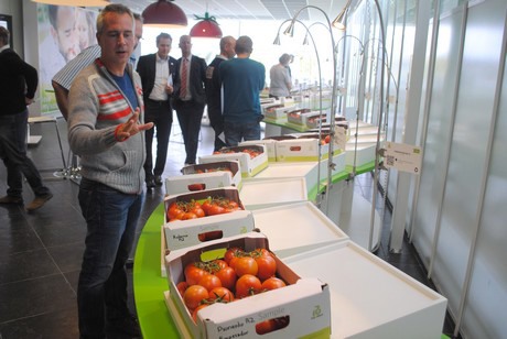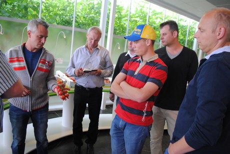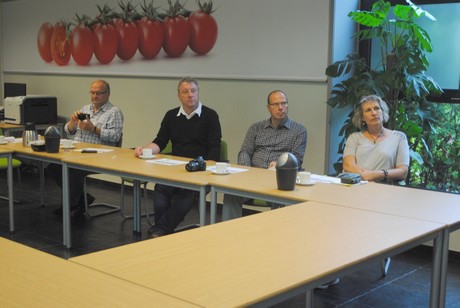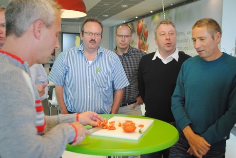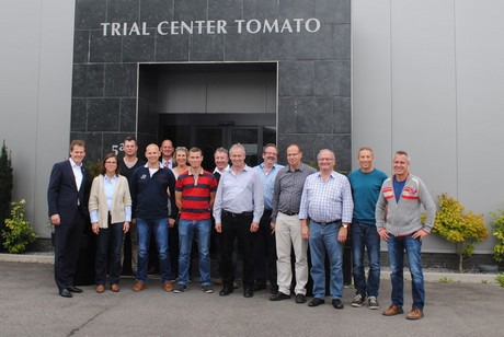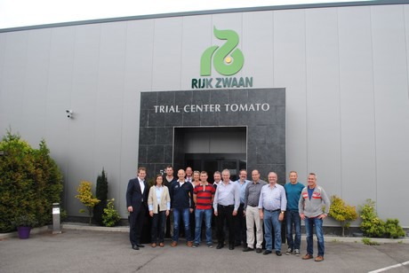 Dinsdag bezochten twaalf Duitse telers onder leiding van Jochem Wolthuis het Trial Center Tomato van Rijk Zwaan, gelegen in Kwintsheul. Het bezoek maakt deel uit van een trip naar de Nederlandse tuinbouw. Onder andere Priva, MPS, de DemoKwekerij, GreenQ en Eosta stonden verder nog op het programma en morgen volgt een verslag van het bezoek aan Gakon. Maar eerst Rijk Zwaan. Het veredelingsbedrijf werd bezocht onder leiding van Christoph Steffl, werkzaam bij de Duitse dochter van Rijk Zwaan in Welver. Hij kent de Duitse, Zwitserse en Oostenrijkse markt en vertelde meer over de doelstellingen van Rijk Zwaan, de kernwaarden (kwaliteit en innovatie) en hoe het bedrijf zich voorbereidt op een groeiende wereldbevolking, minder beschikbare teeltruimte en zaken als overgewicht. Ook trends als snackgroente, de populariteit van convenience en de vraag naar regionaal product is van belang bij de ontwikkeling van nieuwe rassen. Daarnaast toonde Steffl zich bijzonder enthousiast over de platte organisatie. Met zowel directe collega's als met directeur Marco van Leeuwen heeft hij goed contact - en dat ligt aan de korte lijnen binnen het familiebedrijf.