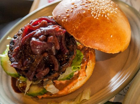Tijdens de trendsessie konden we genieten van de oesterzwamburger. Deze burger is volledig vegetarisch en bestaat uit oesterzwammen en andere champignons
