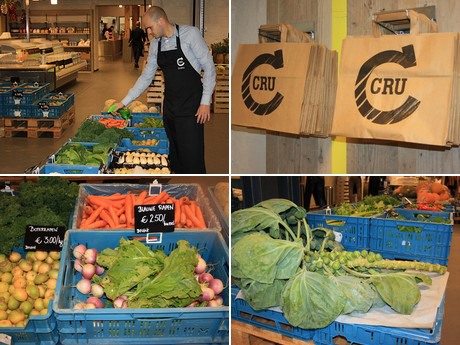 De verschillende ambachten zijn onderverdeeld in afdelingen en bij elke productgroep staan experts die hun vak kennen. Van poelier tot wijnsommelier, bij CRU zijn ze aanwezig. De consument wordt tijdens zijn winkelproces begeleid en kan daar altijd terecht met hun vragen. De CRU winkel begint meteen met de AGF-afdeling waar de producten in kisten worden gepresenteerd. "We bieden wat het seizoen geeft en willen niet te veel producten aanbieden. Ook hebben we geen twintig soorten tomaten hier. De consument krijgt bij CRU geen keuzestress. Wij hebben alleen smaakvolle producten. Als er geen lekkere tomaat verkrijgbaar is, hebben wij die niet in het assortiment. Zo simpel is het", legt zaakvoerder Jeroen van Belleghem uit. "De focus bij groenten en fruit ligt niet persé bij bio of lokaal, maar als deze voor ons een meerwaarde hebben, voeren we ze zeker.