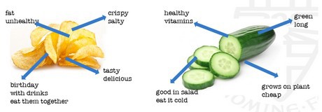 "Daarnaast denken consument bij 'ongezond' voedsel eerder aan kenmerken zoals smaak en het daadwerkelijk eten van het product. Bij chips wordt bijvoorbeeld gedacht aan zout, knapperig, smaakvol en daarnaast ook aan gezelligheid. Gezonde voeding, zoals komkommer, wordt eerder gelinkt aan fysieke eigenschappen, zoals de lengte, de kleur of het feit dat deze aan een plant groeit en gezond is."