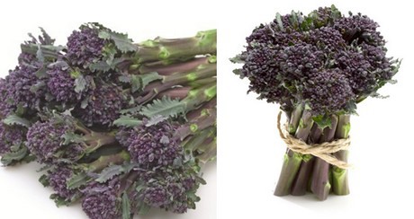 Purple Sprouting Broccoli- Opvallend van kleur en opvallend van vorm is de Purple Sprouting Broccoli. De groente bestaat uit stengels, die ietwat smaken als groene asperges, en roosjes, die smaken als broccoli. "Je hoeft ze maar kort te bereiden: te stomen, te koken, te bakken of te grillen. De hoge concentratie anti-oxidanten blijft behouden."