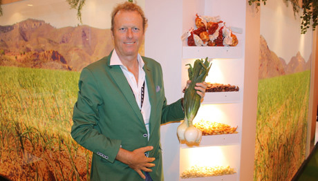 Tot slot promootte Bejo op de beurs in Madrid uien in een bos afkomstig van kortedagplantuien in drie kleuren. "In Spaanse supermarkten zijn deze momenteel enorm populair en we willen ze op de Fruit Logistica ook gaan promoten. Het is geen echte bosui, maar wij noemen het een ui die we bossen. Dat doen we ook in combinatie met andere kleuren. Ze worden verkocht, zoals bijvoorbeeld bospeen", vertelt de directeur van Bejo Iberica. "En het product wordt helemaal gebruikt. De ui veelal voor in salades en de nek voor in de soep!"