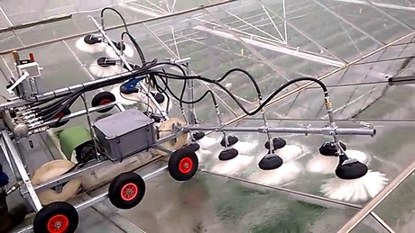 De dekwasser spuit eerst de goot uit, waarna de ruiten worden gereinigd. Beide kanten van de wasser zijn voorzien van acht borstels. "Veel andere dekwassers zijn voorzien van hele lange borstels. Dat is aan de prijs en we merken dat dit beter werkt", vertelt Van der Heijden. De machine is bovendien voorzien van elektrische aandrijving om de tegendruk op te vangen. Kassen tot een gootlengte van 50 tot 60 meter zijn te doen zonder de elektrische (24 volt) aandrijving.