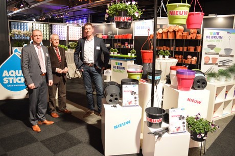 Everard de Bruin, Jan de Bruin en Ted Verbraeken van De Bruin Plantpot. Het bedrijf presenteert in Gorinchem verschillende noviteiten, waaronder (op de voorgrond) een serie potten met innovatief watergeefsysteem.