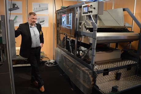 Herman van der Jagt van Hans van der Poel Mechanisatie. Met de semi-automatische leliepotter kunnen twee man 6200 bollen per uur potten.
