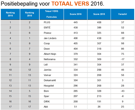 Binnen de versafdeling worden drie categorieën onderscheiden: 'aardappelen groenten en fruit' (agf), brood en vlees. Nettorama heeft, net als vorig jaar, de beste aardappel, groente- en fruitafdeling. Plus staat bovenaan als het om de beste broodafdeling gaat en Emté behoudt haar eerste plaats voor de categorie 'vlees'.