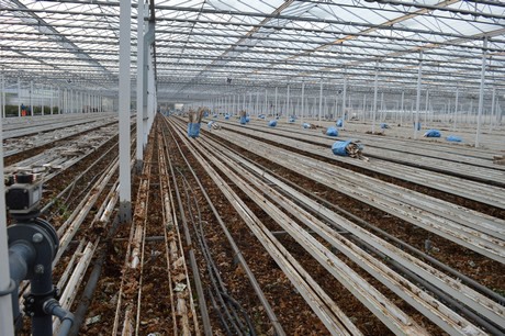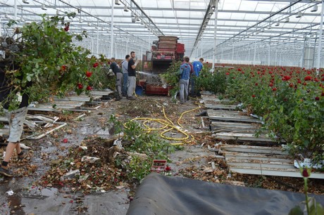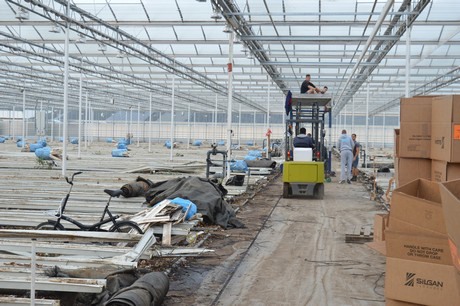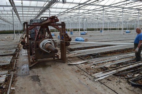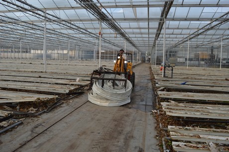 Hoe het ook zij, in de paprikakas komen paprika's en geen rozen en dus moest het eruit. Omdat je 8,5 ha kas niet alleen in een middagje schoonveegt, zijn er partijen op de markt die hierbij een handje kunnen helpen. Zoals de jongens van Modderkolk bv. In 3 weken tijd halen ze het gewas en de goten eruit, demonteren ze de lampen, halen ze de verwarmingsbuizen naar boven, verwijderen leidingen en reinigen de teeltvloer. Vervolgens komt Loonbedrijf J.P. van Nieuwkoop Gouda de vloer egaliseren en profileren.