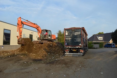 Het vermalen substraat en gewas wordt naar buiten gereden, alwaar een vrachtwagen het wegrijdt naar de composthoop.