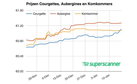 Eind oktober varieerden de courgetteprijzen in verschillende supermarkten van 40 tot 80 cent. Spar heeft de hoogste prijs, Jumbo de laagste. Dit product maakt vanaf eind november ook een lichte prijsstijging mee, maar komt tot 21 december nergens boven de euro uit. Hoogvliet en Spar gaan eind december omhoog met de courgetteprijs. Hoogvliet zit net boven de 1,20 en Spar zit begin januari op 1,30. Op 17 januari zitten de meeste supermarkten nog onder de 1,40. Gezien de mogelijke tekorten in de komende weken kan dat natuurlijk nog wijzigen.
