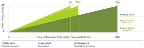 Het gebruiksgemak van het Tom-systeem is voor veel telers een reden om over te stappen. "Om een gewas in te draaien of te clippen heb je ervaren mensen nodig, maar met het Tom-systeem heft iedereen het in een mum van tijd onder de knie. Het Tom-systeem kan snelheden van 1500-1600 planten per uur verwerken, tegenover 1000 planten per uur bij manueel clippen.