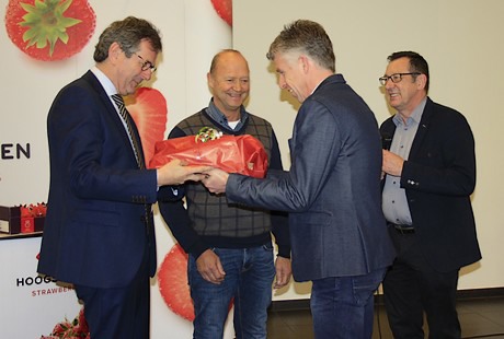 Viering 20-jarige samenwerking met CLTV. Directeur van CLTV Erik Bastiaensen en voorzitter Rinie van Tilburg overhandigden het cadeau aan Gaston Opdekamp, directeur van Coöperatie Hoogstraten.