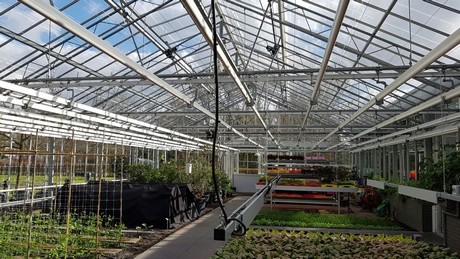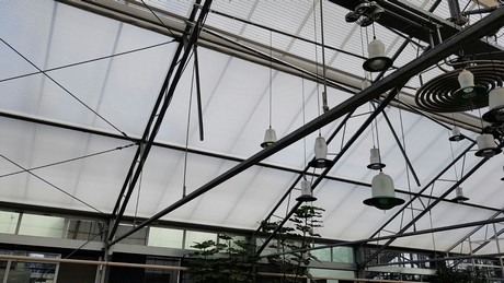 De Kas is natuurlijk geen hectares grote kwekerij. Toch hangen er behoorlijk wat scherminstallaties in. Zo is de vergaderruimte voorzien van een "dubbel" dekrolscherm. "Eén scherm voor zonwering en één verduisterend doek, zodat er binnen presentaties gegeven kunnen worden", vertelt Jeroen. Ook in het grote en in het kleine restaurant zijn dekrolschermen geïnstalleerd en de eigen kweektuin is voorzien van een horizontale scherminstallatie.