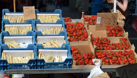 een kilo asperges voor 3,99 euro en een doos aardbeien voor 1,99 euro