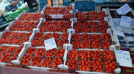 Hoewel het volop aardbeienseizoen is, zijn er in twee van die fruitkramen geen aardbeien te krijgen. "Gisteren had ik wel goede handel in aardbeien, vandaag was er een klein aanbod bij de groothandel en waren de aardbeien duur", vertelt Toufik. Aardbeien prijzen variëren van 1,99 per bakje voor aardbeien zonder duidelijke herkomst tot 4,50 euro per bakje. Op de markt worden de bakjes ook altijd per twee stuks voor een voordeliger prijs aangeboden. Een kraam bood ook zogenaamde 'buitenbeentjes' aan, aardbeien met afwijkende vorm. Die bakjes kosten 1,25 euro en per 3 betaal je er 1 euro voor. De meeste aardbeien worden gepresenteerd in de oorspronkelijke dozen, meestal komen ze van veiling Hoogstraten, bij twee kramen waren aardbeien verpakt onder het BelOrta-label. Deze waren goedkoop, 2 dozen voor 5 euro.
