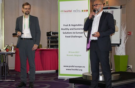 Andreas Schneider en Matthias Rohra van ProVeg International lieten tijdens het gemeenschappelijke event van Freshfel en ProVeg op 20 juni een indrukwekkend filmpje zien van de impact van het eten van vlees op de aarde. Als dit zo doorgaat, zou het de wereld zelfs kunnen vernietigen. Dit is een nieuwe internationale organisatie die de wereldconsumptie van dieren met 50% wil laten dalen in 2040. Zij willen naar een wereld waar iedereen kiest voor lekker en gezond voedsel wat goed is voor alle mensen, dieren en de de wereld. "We zijn actief om mensen een meer plantaardig dieet te laten volgen. Daarnaast willen we consumenten onderwijzen, ook de scholen. We hebben ook al zaken bereikt: een producent van snoep heeft het gelatine gehalte gereduceerd. Je staat er soms van te kijken hoe veel producten er nog resten van dieren bevatten."