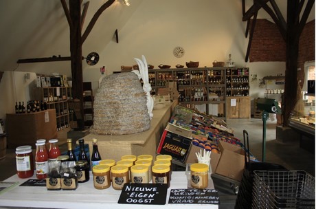 Verse groenten in De Lindehoeve met op de achtergrond verschillende andere producten zoals jam en olijfolie.