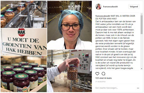 Creatief Op het gebied van influencer marketing is inmiddels heel veel mogelijk. Vaak gaat het dan om bekendheid genereren rondom een merk of een product. Een marketingcampagne op de blog van de influencers kan goed aangevuld worden met hun populaire social kanalen, vertelt Jojanneke. Een goed voorbeeld is de succesvolle bonencampagne van HAK. "Het gezicht van de HAK-campagne, de bekende Nederlandse chef-kok Herman den Blijker, werd gekoppeld aan een aantal influencers die door hem tot ambassadeur van een bepaalde boon werden benoemd. De influencers zijn vervolgens het hele jaar aan de slag gegaan met het genereren van mooie content over de boon. Ze kookten samen met Herman en maakten een aantal recepten met 'hun' boon. Ook bezochten ze evenementen en gingen op excursie in de HAK-fabriek. Zo brengen we de online wereld naar de offline wereld en andersom."
