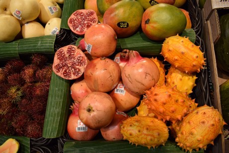 Op de AGF-afdeling moet alles zo vers en mooi mogelijk zijn. Het complete gamma is aanwezig. Momenteel is het druivenfestival, dus die nemen heel wat meters schapruimte in. Verder zijn er diverse schappen met fruit. Het aanbod in exoten, specialiteit van Group A. De Witte, is zeer uitgebreid. De vruchten zijn ook schoon van binnen en dat laten ze dan ook zien. In de koeling zijn er in deze tijd van het jaar heel wat meters gereserveerd voor de wintergroenten ten koste van de zomergroenten. Delhaize introduceerde onlangs de 'Biometer', dus de eerste meter van de koeling is beschikbaar voor het bio-assortiment.
