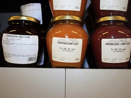 Onder andere pompoen, aardbei en kaki worden verwerkt in de confituren.