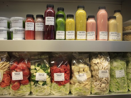 De sappen en gesneden groenten worden in eigen keuken gemaakt.