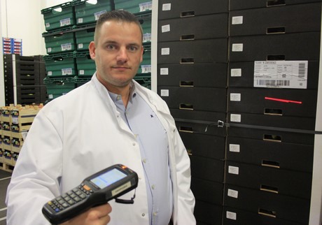 Wanneer de peren in dit geval sorteerbaar zijn gemaakt, gaan de versproducten naar een koelcel om vervolgens naar de klanten te gaan. "Wanneer de pallets klaar worden gezet om in de vrachtwagen geladen te worden, komt de barcode op de sticker van pas. Met een scanner wordt de barcode uitgelezen, waardoor de persoon alles weet van de peer zonder het fruit uit de doos te hoeven halen en te controleren. Naast het traceren van het gesorteerde fruit, doen wij hetzelfde bij de lege kratten die overblijven. Daar passen wij hetzelfde systeem toe."