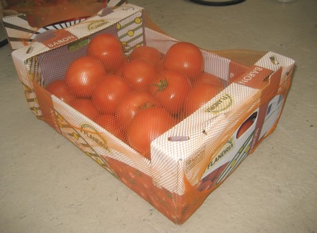 Dankzij het plastic net kunnen de tomaten niet uit de kist vallen of gepakt worden.