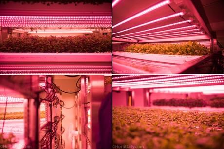 Teeltechnisch is het voor diezelfde gemiddelde tuinder verder allemaal niet zo spannend. Er wordt in een steriele omgeving gezaaid op NFT goten, de boel ontkiemt vervolgens in een 20 voet reefercontainer om vervolgens te worden opgekweekt in de daadwerkelijke vertical farm: een redelijk geavanceerde klimaatcel met een vierlagensysteem waarin met behulp van LED verlichting de kiemgroenten en bladgroenten verder worden doorgeteeld.