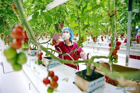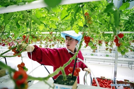 Een arbeider plukt tomaten in de hypermoderne kas in Pingliang City in de provincie Gansu, 9 november 2017. (Xinhua/Yang Xin)