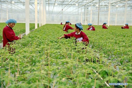 Arbeiders zijn druk bezig met zaailingen in een hypermoderne kas in Pingliang City in de provincie Gansu, 9 november 2017. (Xinhua/Yang Xin)