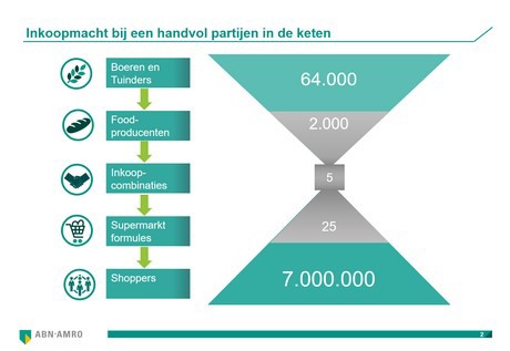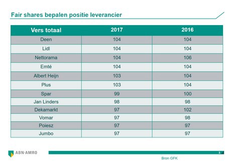 Het aantal consumenten dat let op de herkomst van groente en fruit stijgt, blijkt uit onderzoek van GfK en Abn Amro. De trends verschillen per land maar het is er wel een die doorzet. De omzet van keurmerken groeien stevig door en duurzaamheid domineert de agenda van de foodsector maar kan in de knel komen. Consumenten in Europa zijn opgeleid om op prijs te kopen, in Nederland ligt het volume eten en drinken verkocht in promotie met 25% iets hoger dan gemiddeld in Europa. Het Verenigd Koninkrijk is een uitschieter met 50%. "Als supermarkten blijven concurreren op prijs, is dat een heilloze weg. Er komt een kanteling, want nu betalen de fabrikanten de rekening. Zij kunnen de retailer nog meer helpen om waarde toe te voegen: nieuwe producten en concepten zodat shoppers royaler en loyaler worden." De fair shares bepalen hierbij indirect de positie en bijdrage van de leverancier. Dat is het marktaandeel in vers in vergelijking met het totale marktaandeel van de formule. Ketens met een score van boven de 100 halen dus relatief een hoog percentage van hun omzet uit vers. Data en inzichtelijkheid in het productieproces (waar komt deze appel vandaan?) worden daarbij steeds belangrijker.