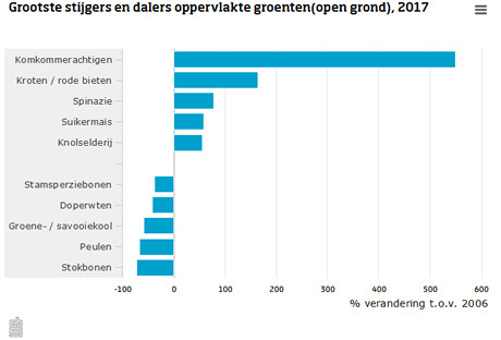 Teelt van vollegrondgroenten neemt steeds meer land- en tuinbouwgrond in beslag. Op 1 april 2017 werd op bijna 87 duizend hectare groenten geteeld, 13 procent meer dan in 2006. Vergeleken met het jaar 2000 is er zelfs sprake van een groei van 27 procent. Van alle groenten steeg het areaal komkommerachtigen, zoals courgettes en pompoenen, relatief het hardst. Ui is meest geteelde groente. Daarom was het goed nieuws dat de