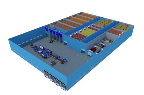 Een animatie van een groot distributiecentrum, zoals in India gerealiseerd kan worden.
