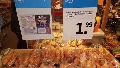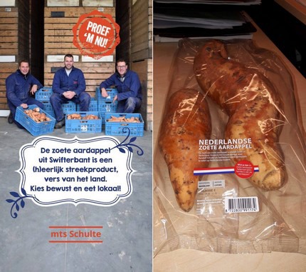 Maatschap Schulte mocht meteen een stempel drukken op hun nieuwe product. De zoete aardappelen werden verkocht in een flowpack waarop de naam en plaats van de teler en uitleg over de zoete aardappel staan vermeld. Deze duidelijke herkomst maakte de Albert Heijns in Zeewolde en Dronten extra enthousiast en ze claimden het product als 'van ons'. In de twee winkels werd een banner van de Maatschap met foto's van de trotse telers geplaatst en een banner met "geteeld in Swifterbant, verpakt in Dronten". Of dat de verkoop positief heeft beïnvloed, is Randolf niet bekend.