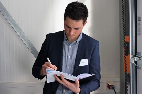 Sjors Beijer (Klassmann-Deilmann) maakt druk aantekeningen.