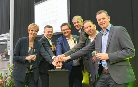 V.l.n.r. Ilone Ammerlaan, Bert van der Lugt, Hans Grootscholten, Jos Stoit, Fred van Hezel en John Ammerlaan.Met een officiële druk op de knop verscheen het nieuwe bedrijfslogo van Plantise.