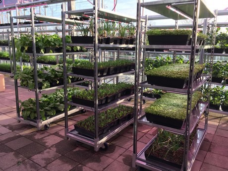 Parus Europe leverde de karren en de belichting voor de kas. "We hebben twee soorten belichting geleverd. Boven de karren een voor het oog wit licht, dat voldoende is om het gewas te laten groeien, maar niet krachtig genoeg om daadwerkelijk te kweken", vertelt Sandro van Kouteren. "Zodoende belichten we niet het hele centrum van Utrecht," lacht hij.