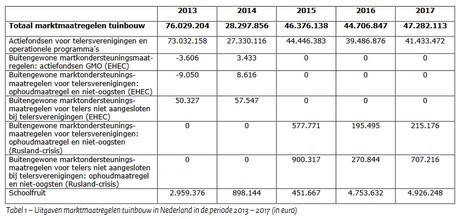 In 2016 en 2017 heeft een aantal producentenorganisaties verder afgezien van het indienen van een nieuw operationele programma. In 2011 werd de tuinbouw geconfronteerd met de EHEC-bacterie crisis. In dat kader heeft de Europese Unie buitengewone markt- ondersteunende maatregelen getroffen. De laatste betalingen in dit kader zijn gedaan in 2014. In 2014 zijn er ook buitengewone maatregelen getroffen in reactie op het invoerverbod dat Rusland op bepaalde landbouwproducten, waaronder groente en fruit, had ingesteld.