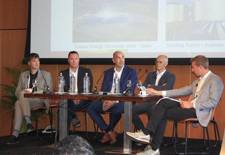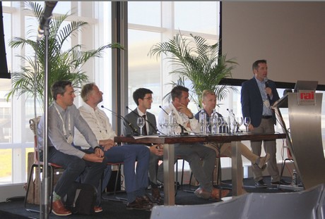 Het panel van links naar rechts: Andreas Hofland (HortiKey) Steven Newell (Windset Farms), Edward Verbakel (VB Group), Vincent Deenen (Grodan), Mark Durno (Rockstart).