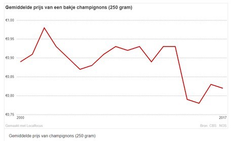 Hoewel de kosten voor de champignonteelt jaarlijks stijgen, vertoont de consumentenprijs in supermarkten een dalende trend. In 2014 vond een sterke prijsdaling plaats van gemiddeld 93 cent naar 0,79. In 2017 ligt de prijs gemiddeld 0,82 cent volgens cijfers van het CBS en NOS, maar die moet volgens Ko Hooijmans naar 0,99 cent.