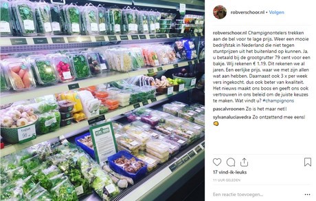 In de detailhandel ligt de prijs voor consumentenprijs voor champignons overigens flink hoger. "Wij rekenen € 1,19. Dit rekenen we al jaren. Een eerlijke prijs, waar we met zijn allen wat aan hebben", aldus groentenspecialist Rob Verschoor.