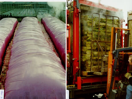 Het aanleveren en ophalen van de benodigde materialen (stoomzeilen, kettingen en brandweerslangen voor het vast leggen van de zeilen) gebeurt in overleg met de opdrachtgever. "Om een zo optimaal mogelijk resultaat te bereiken, is het belangrijk dat het substraat goed droog is. Ook is het op de juiste wijze stapelen van groot belang", vertelt Luc. "Indien het mogelijk is om binnen te stomen, verdient dit de voorkeur. Dan hebben de weersomstandigheden geen invloed op het stoomproces.