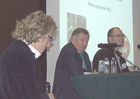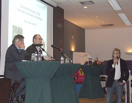 Dagvoorzitter Pieter van Dijk interviewt Cor van der Kaaij en Jeroen Kavelaars