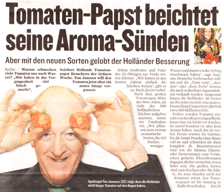 Tholen - Ton Janssen van Tasty Tom heeft flink genoten tijdens de GrĂ¼ne Woche in Berlijn afgelopen week. Na een oproep van Minister Verburg dat de lekkerste tomaten uit Nederland aanwezig waren op de beurs, stonden de Duitsers in de rij om stukjes Tasty Tom-tomaten te verorberen. "Het was fantastisch. We hadden een paar dozen tomaten mee om te laten zien, maar hebben uiteindelijk vier pallets tomaten uitgedeeld."